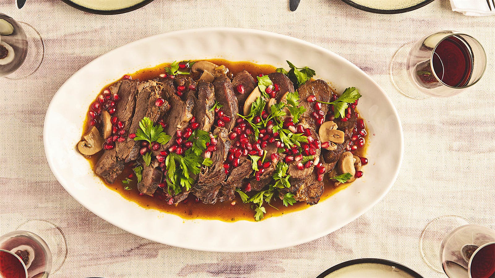 7. Transfer the meat to a cutting board and let rest for 15 minutes. Cut into 1/4 inch-thick (6 millimeter) slices. Serve warm on a platter topped with the sauce, pomegranate seeds and fresh thyme. Makes 8 to 10 servings
